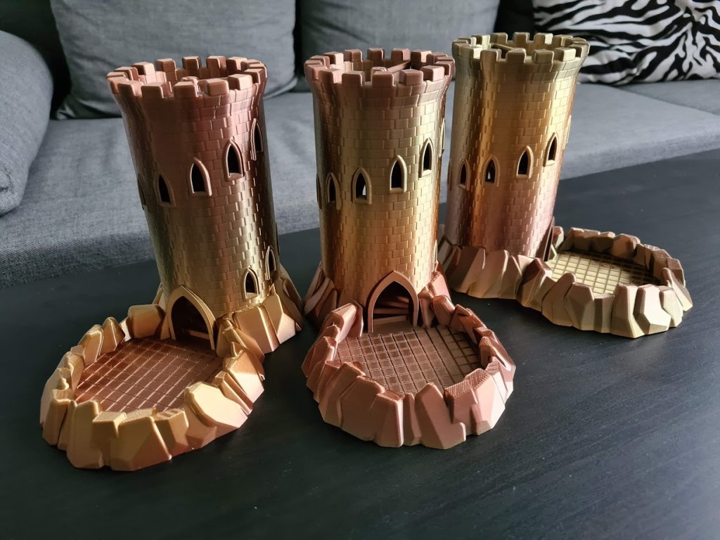Velká házecí věž Gold: 3D tištěná házecí věž na kostky v barevném provedení (zeleno-zlato-měděná metalíza). Házecí věž pojme standardní kostky o velikosti 16mm, výška věže cca 20cm. Autor modelu: hirthwork
