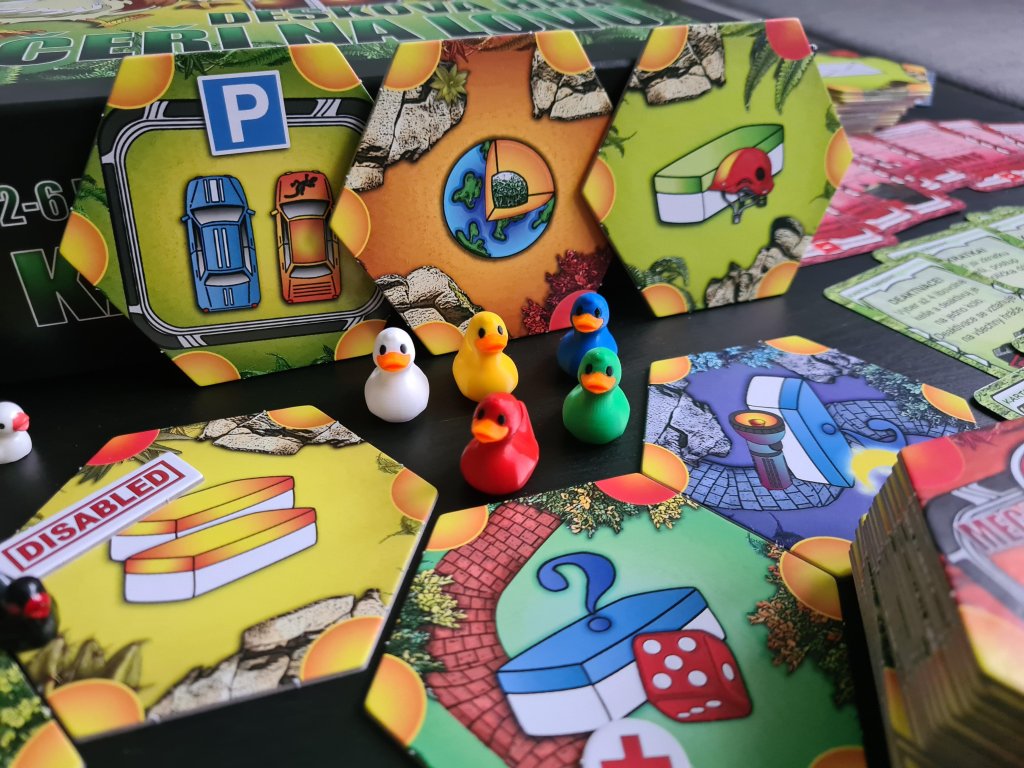 KACERINALOVU.CZDesková hra obsahuje: 6 karet kačerů, 6 figurek kačerů, 3 speciální promokarty pro herní módy, kartiček jednorázového vybavení, 37 hexagonových polí pro keše a eventy, 108 kartiček s keškami, 30 karet náhody, 150 kusů „logovacích“ žetonů, 12 kusů žetonů imunity, 10 štítků pro „disablování“ keše, 2 herní kostky